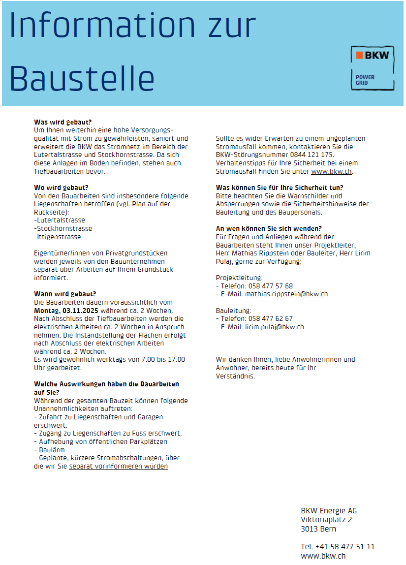 Die Bauarbeiten beginnen am Montag, 03. November 2025 und dauern ca. 2 Wochen. Für weitere Angeben siehe "Information zur Baustelle" der BKW.